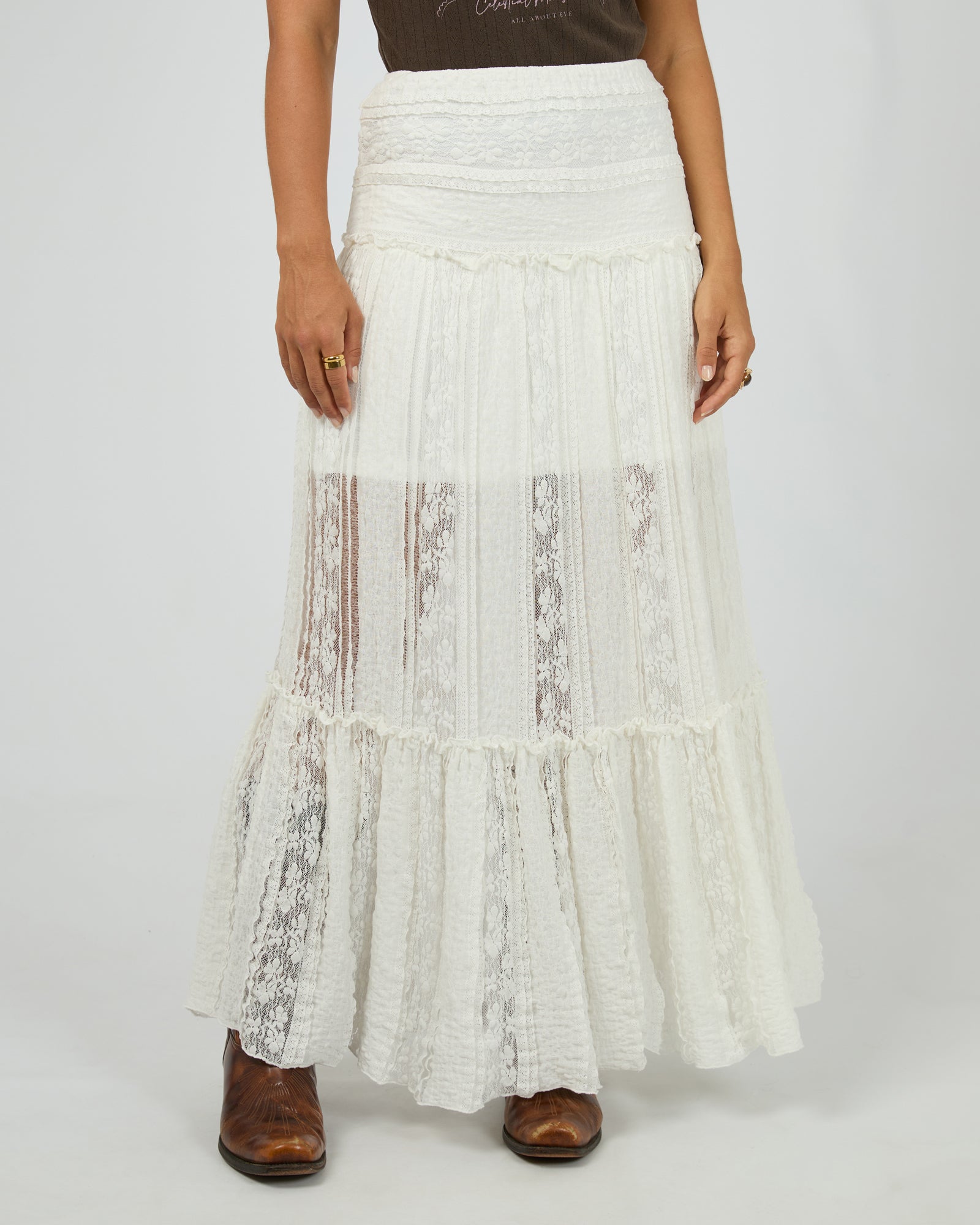 Vintage romance meets modern edge in the Jessie Maxi Skirt, crafted from soft stretch lace layered over a solid base. The wide drop waistband panel flatters the waist and elongates the silhouette, making it perfect for pairing with cropped tees or fitted tanks. Style it up or down for effortlessly cool, throwback vibes.