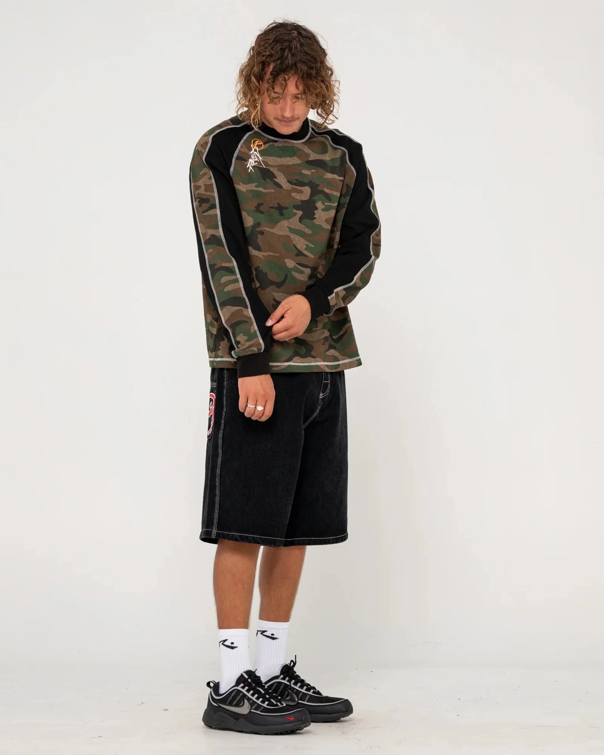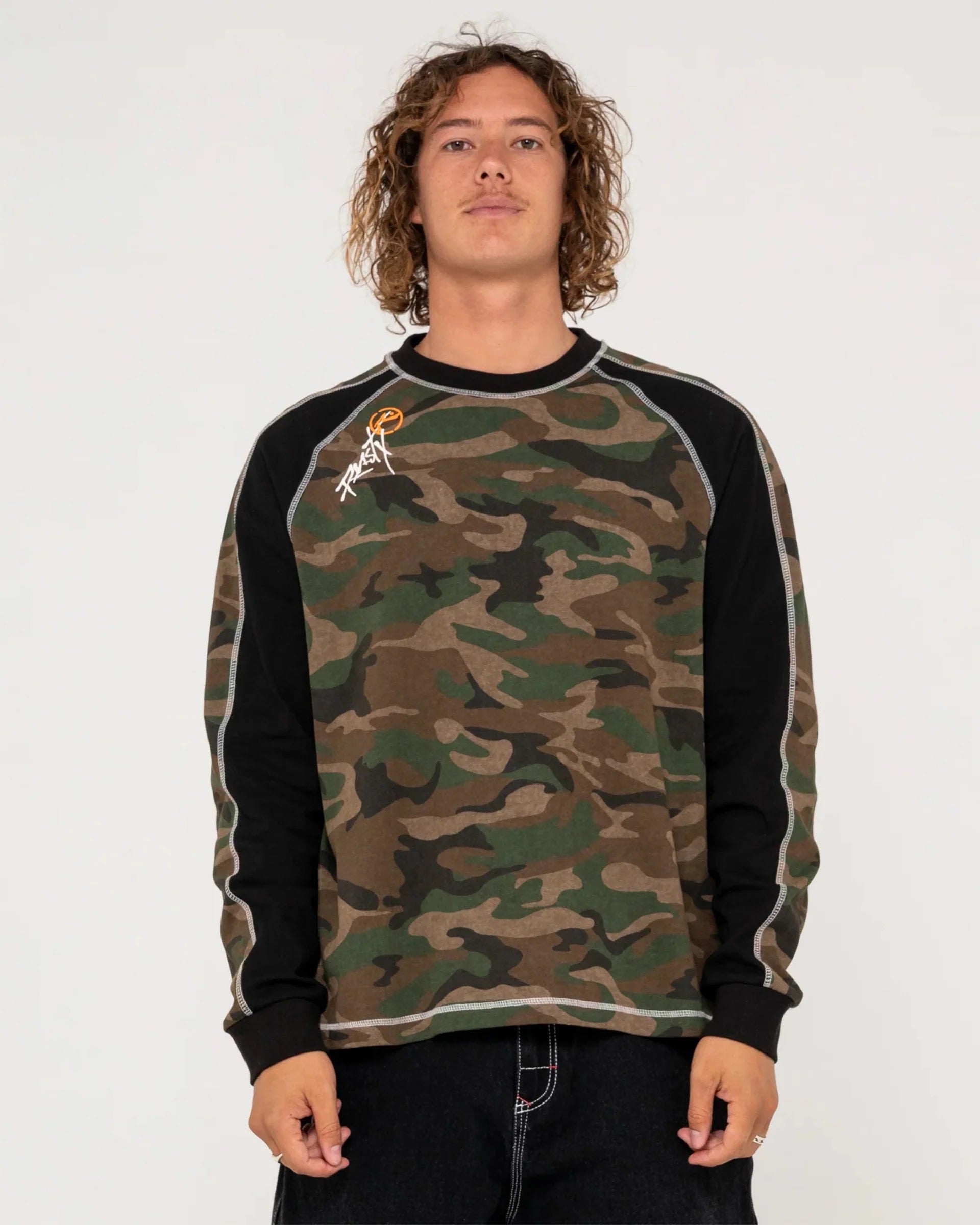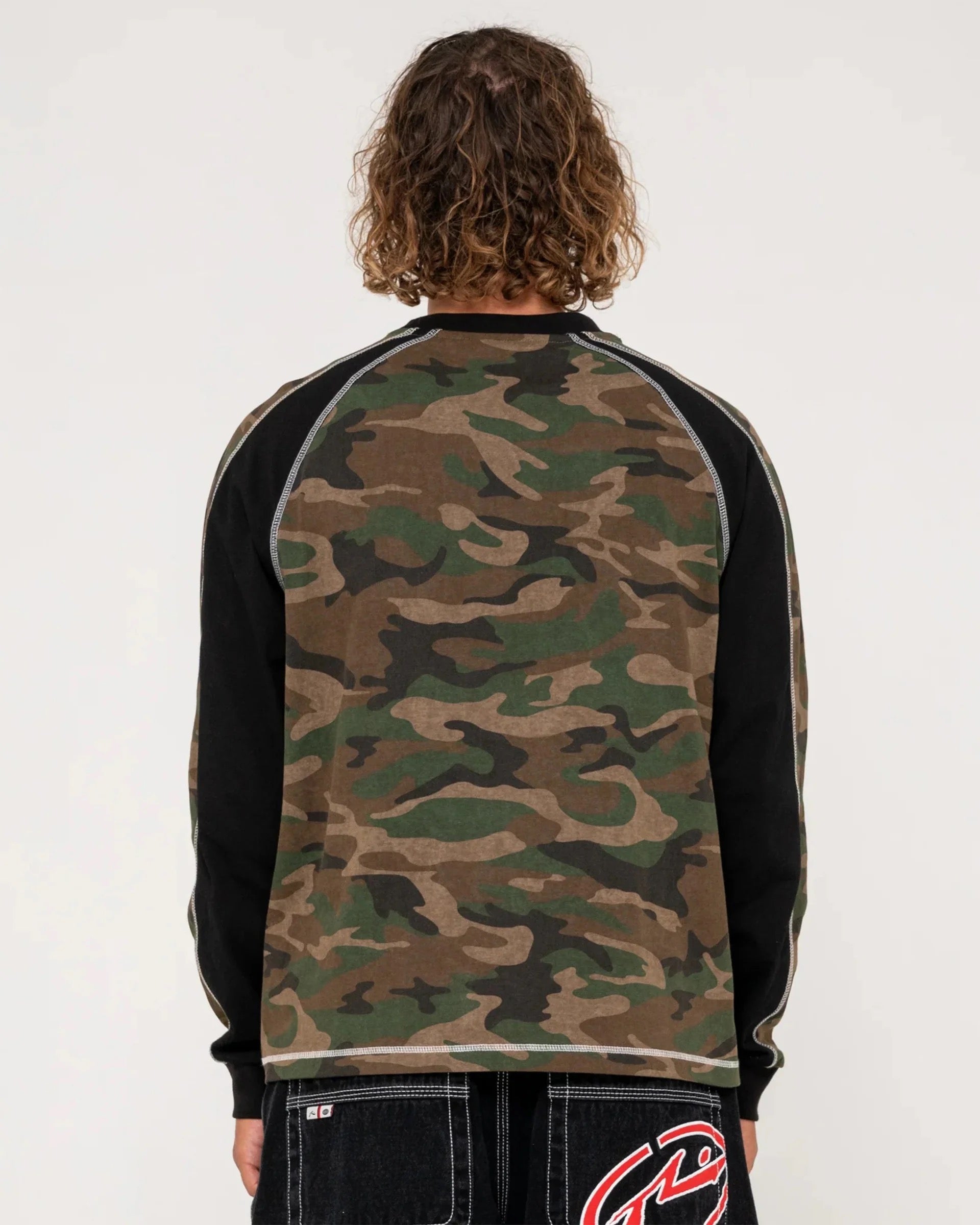 Long sleeve tee with camo body and black raglan sleeves. Features a Rusty embroidery.