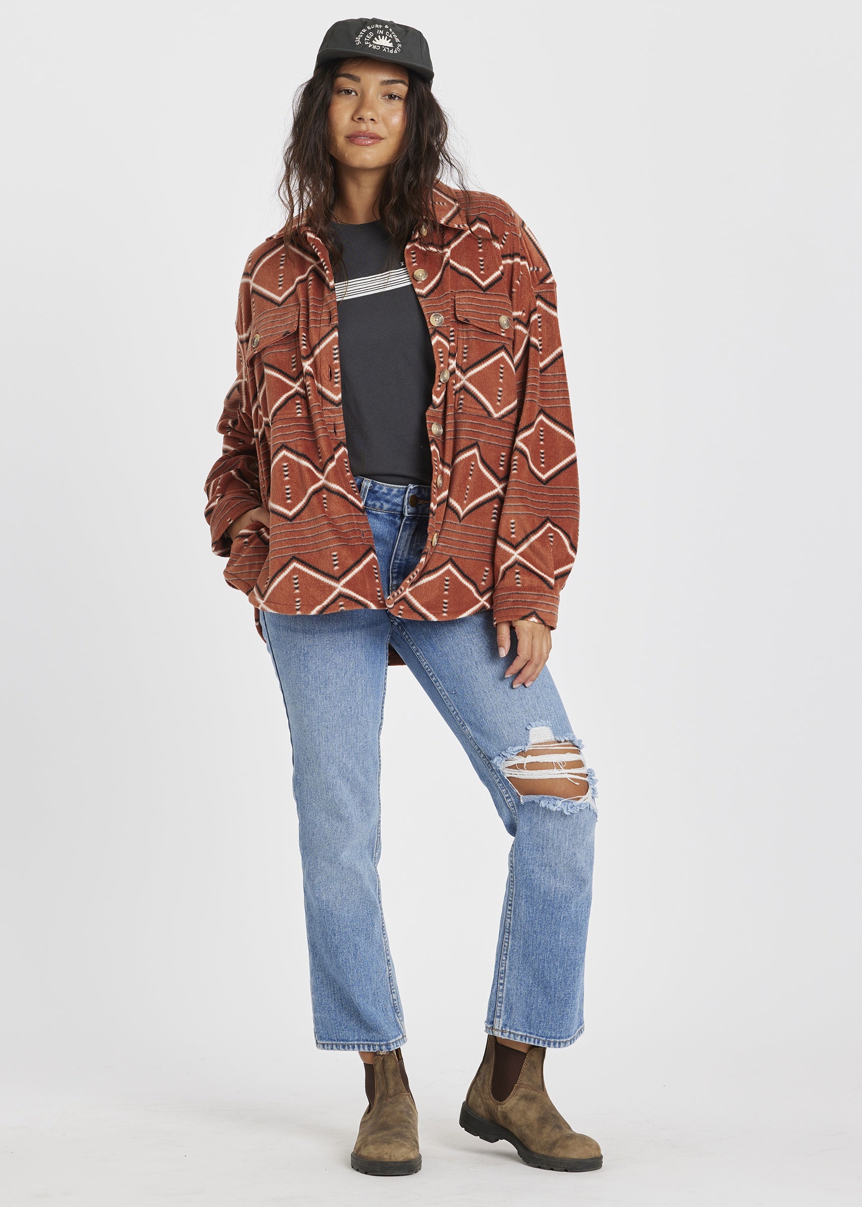Liven up your wardrobe with this fleece shacket featuring roomy front patch pockets and a charming saddle hem.